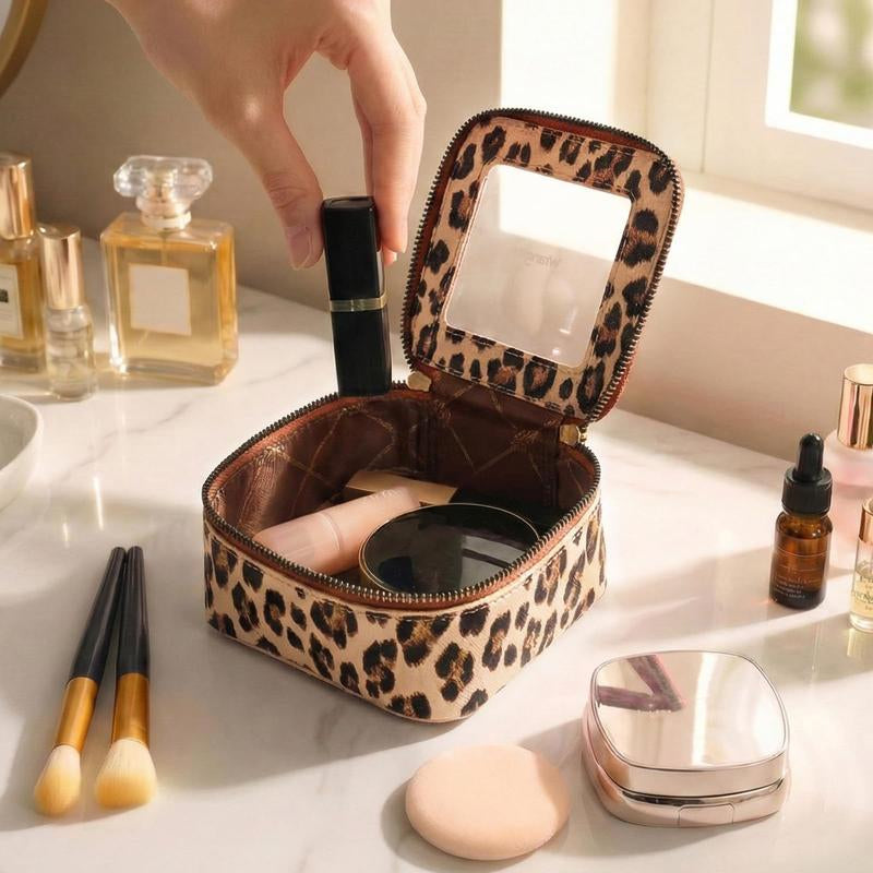 Available in two practical sizes—8.3" x 2.3" x 6.2" and 5" x 2.5" x 5"—this makeup bag combines a sleek profile with surprising capacity. The rigid materials allow it to hold more without bulging or losing its form, easily accommodating makeup kits, electronics, and all your travel essentials.